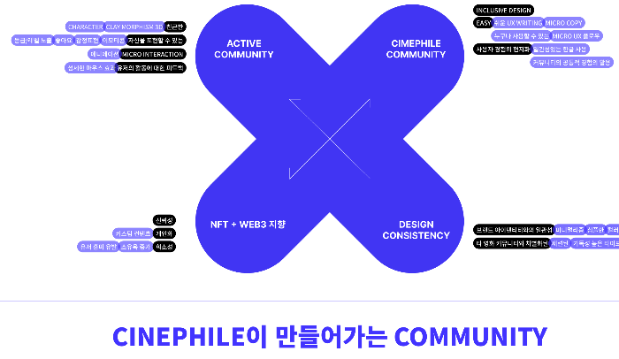 A, que ficará responsável pelo conteúdo, achou que seria bom ter um lugar barulhento mesmo que estivesse cheio de postagens e memes fúteis, e por questões de negócios e planejamento, estava pensando em fazer um brunch na indústria cinematográfica como melhora, artigos escritos serão publicados Bem. Isso significa que deve ser agradável, mas também deve ser lido com uma escrita refinada para fãs de cinema com hobbies e preferências claras… Pode-se dizer que este projeto quer matar dois coelhos com uma cajadada só. Então, que tipo de design devemos projetar e para quem? Foi, portanto, necessário determinar quem utilizaria esta comunidade e ser objetivo do ponto de vista das partes interessadas.