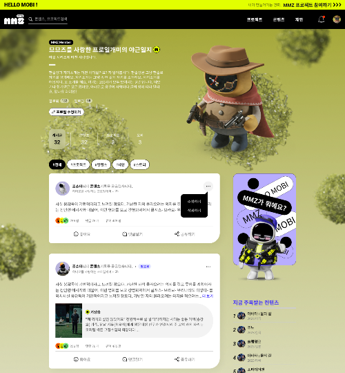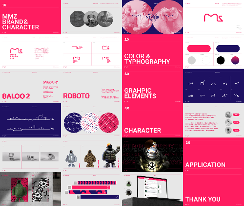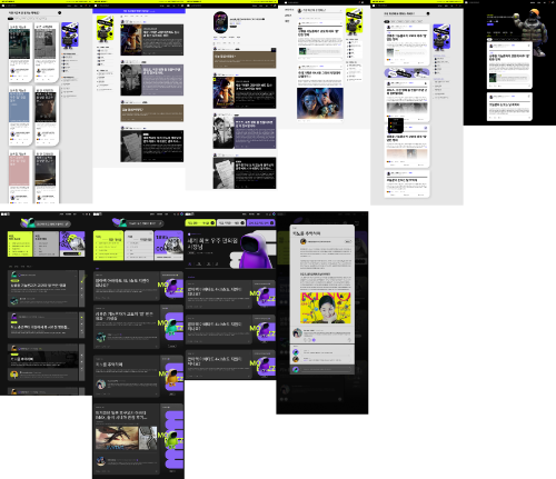 Uma referência semelhante foi o site do catálogo de moda do HAPE PRIME, mas a natureza do site em si é diferente, então a quantidade de informações é fixa, enquanto MMZ é uma página que exibe dados do usuário, por isso combina com objetos de fundo e PFP para exibir dados do usuário dados que precisam ser carregados imediatamente. Porque como a quantidade não pode ser medida, a legibilidade do texto depende da cor, da velocidade de carregamento dos dados, da capacidade da imagem… Foram necessários muitos testes para ter em conta situações imprevistas que pudessem surgir.